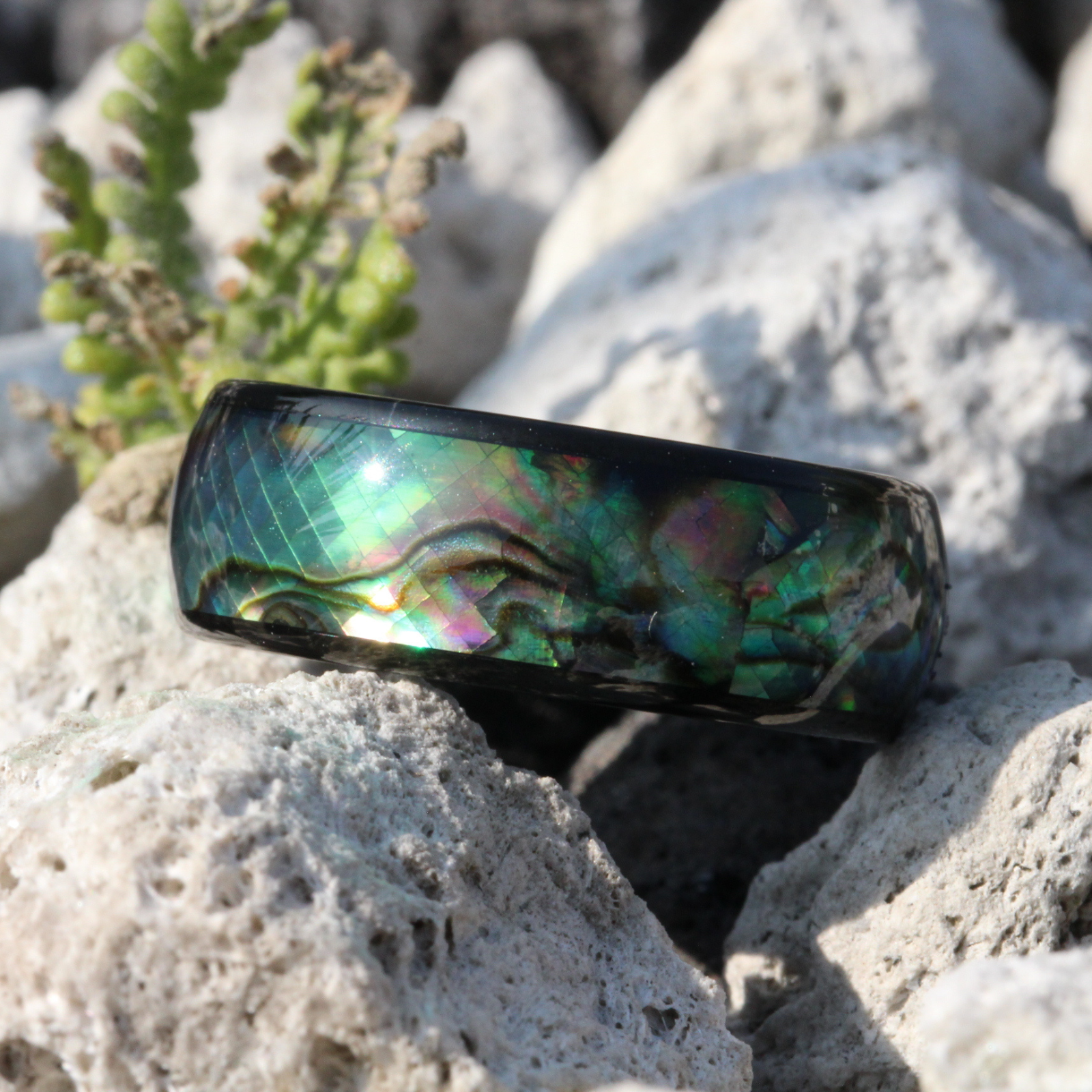 El anillo Abulón combina la fuerza del carburo de tungsteno con la belleza natural del abulón auténtico. Cada pieza refleja tonos únicos de azul y verde que cambian con la luz, evocando la profundidad del mar. Resistente, elegante y con un brillo que no se opaca, es el anillo ideal para quienes buscan estilo y carácter en una sola pieza.